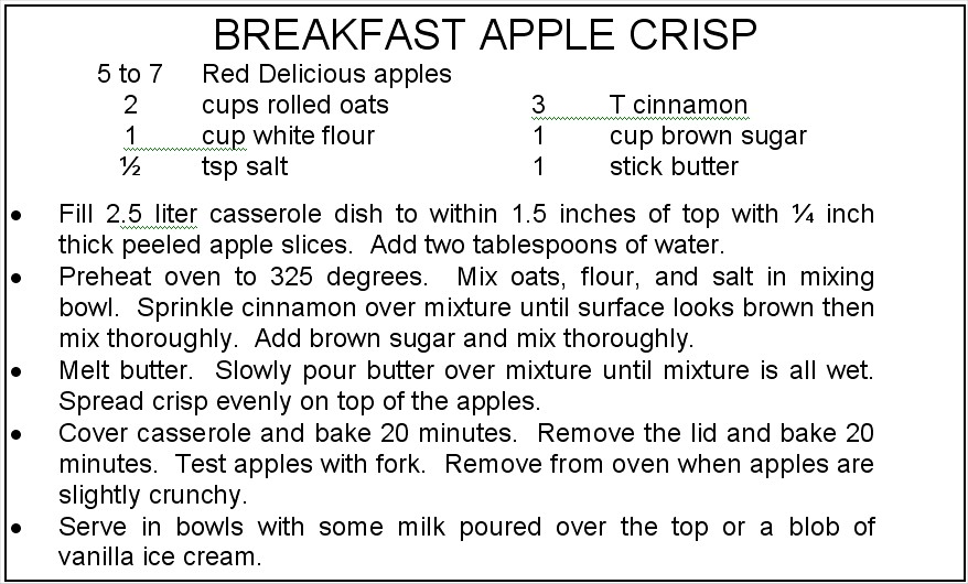 | John started making apple crisp while serving as a missionary in France. The recipe below was refined over time to its perfection. Apple crisp has been a family favorite breakfast or lunch for many years. John made two of them during the months that Stanford was undergoing chemotherapy on 26 Nov 2006 and 12 Jan 2007. Stanford loved the family celebration of apple crisp. After Stanford died on 23 Jan 2007 John wasn't able to bring himself to make apple crisp again for a long time. After almost two years and with the family all gathered together for Christmas, it was time once again to make the "World's Best Apple Crisp". The pictures below show all the steps. More pictures were taken during an apple crisp making session on 3 Jan 2009. An improved website will be coming soon to explain in better detail all the steps. |